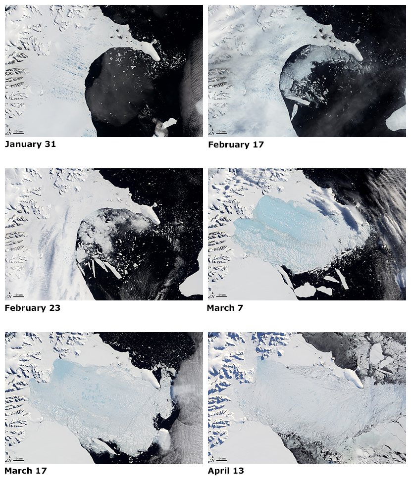 Najbardziej dramatycznym przykładem jest Lodowiec Szelfowy Larsena. Znajduje się on po wschodniej części Półwyspu Antarktycznego, a urozmaicone wybrzeże pozwoliło podzielić go na cztery fragmenty: A, B, C i D. Rozpad lodowca zaczął się już w latach 70., kiedy w ciągu dwóch kolejnych dekad Lodowiec Szelfowy Larsena A (najbardziej wysunięty na północ) zniknął niemal całkowicie. Z początkiem 2002 to samo stało się z częścią B. Z kolei w latach 2010-2017 na Lodowcu Szelfowym Larsena C – największej części kompleksu – doszło do serii pęknięć równoległych do czoła lodowca, które poskutkowały fatalnym odłączeniem się znacznej części lodu.
